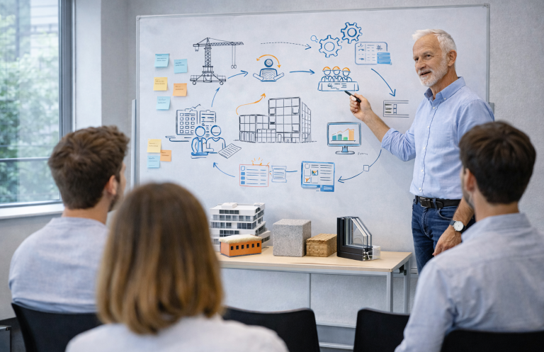 Wir bleiben fachlich vorne: durch regelmäßige interne Tech-Updates, kurze Tool- und Methoden-Sessions und das Teilen von Best Practices aus laufenden Projekten. Neue Normen, BIM-Work-flows, Material- und Detailwissen, KI-Tools oder Nach-haltigkeits-Tools werden bei uns aktiv getestet, dokumentiert und ins Team getragen – damit jeder vom neuesten Stand profitiert und nicht bei Null anfangen muss.